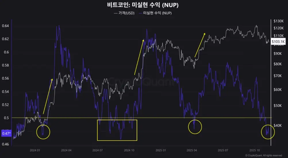 链上数据强调了 100 美元附近的短暂积累,表明局部支撑,但如果短期持有者的成本基础没有果断收回,上行势头可能会受到限制。链上读数支持触底前景。正如 CoinDesk周三指出的的那样,比特币的净未实现利润 (NUP) 比率已降至 0.476,这一水平在历史上预示着短期市场触底。