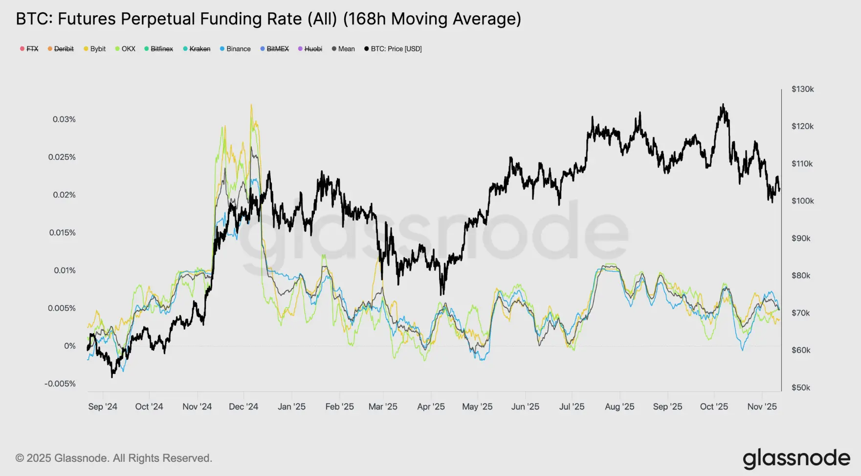 主要交易所的比特币永续期货融资利率仍然低迷,凸显了衍生品市场缺乏投机兴趣。自 10 月份杠杆冲高以来,资金利率和未平仓合约均有所走低,这表明交易者对方向敞口有限保持谨慎。这种缺乏激进头寸反映了市场犹豫的一个阶段,通常在波动重新出现之前就会出现。目前,衍生品格局保持平静和平衡,倾向于中性情绪而不是投机驱动的势头。