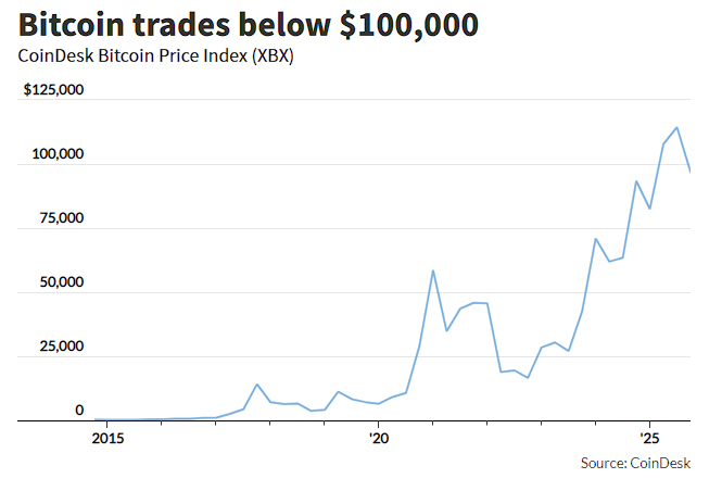 然而,比特币却完全没有参与这场反弹盛宴。周五比特币下跌5%,最低触及94519美元,为5月6日以来最低点,全周跌幅达9.14%,创下自2月28日当周以来最差单周表现。自10月5日触及126272美元的历史高点以来,比特币已累计下跌约25%。