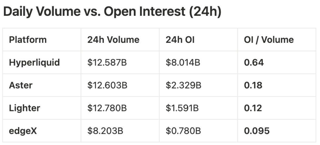 Aster & Lighter:低持仓量/交易量比(约0.18和0.12) 表明交易周转率高,但持仓资本较少,这通常是激励驱动活动而非稳定流动性的标志。