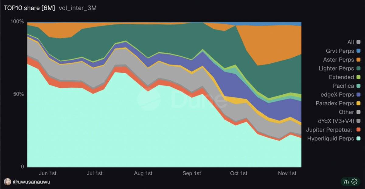 在过去的一年中,Hyperliquid一直占据统治地位,其市场份额在5月达到巅峰,占链上永续合约交易量的71%。然而,时间来到11月,Hyperliquid的市场份额已骤降至20%,而新的竞争者正在迅速崛起并瓜分市场: