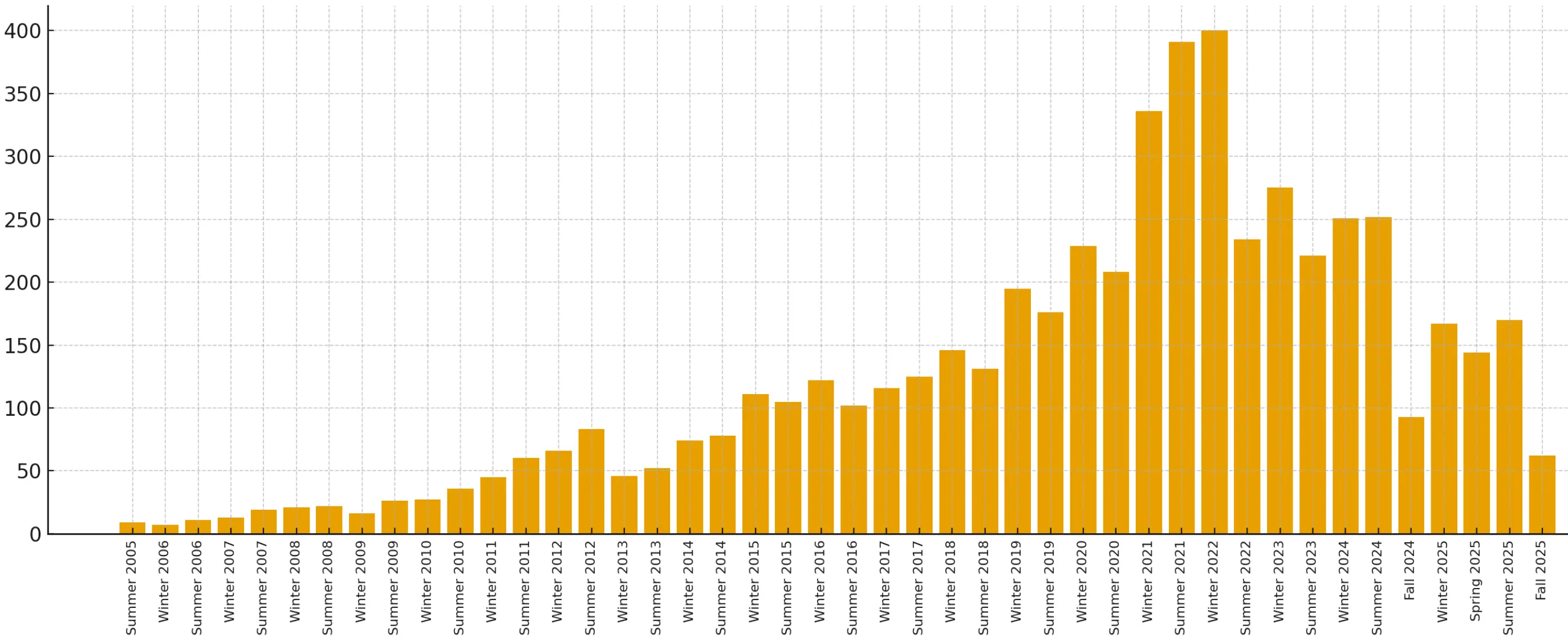 我毫不怀疑,YC 至少在最初的十年里,对世界绝对是利大于弊的。但不知从何时起,游戏规则改变了。初创公司不再那么不透明;它们变得更容易被理解。YC 不能再仅仅是揭开面纱;它必须“大规模生产”。规模从最初几年的 10-20 家,激增到 2015 年的 100 多家,最终在 2021 年和 2022 年达到每批 300-400 家的顶峰。虽然这个数字有所下降,但现在每批仍有约 150 家。