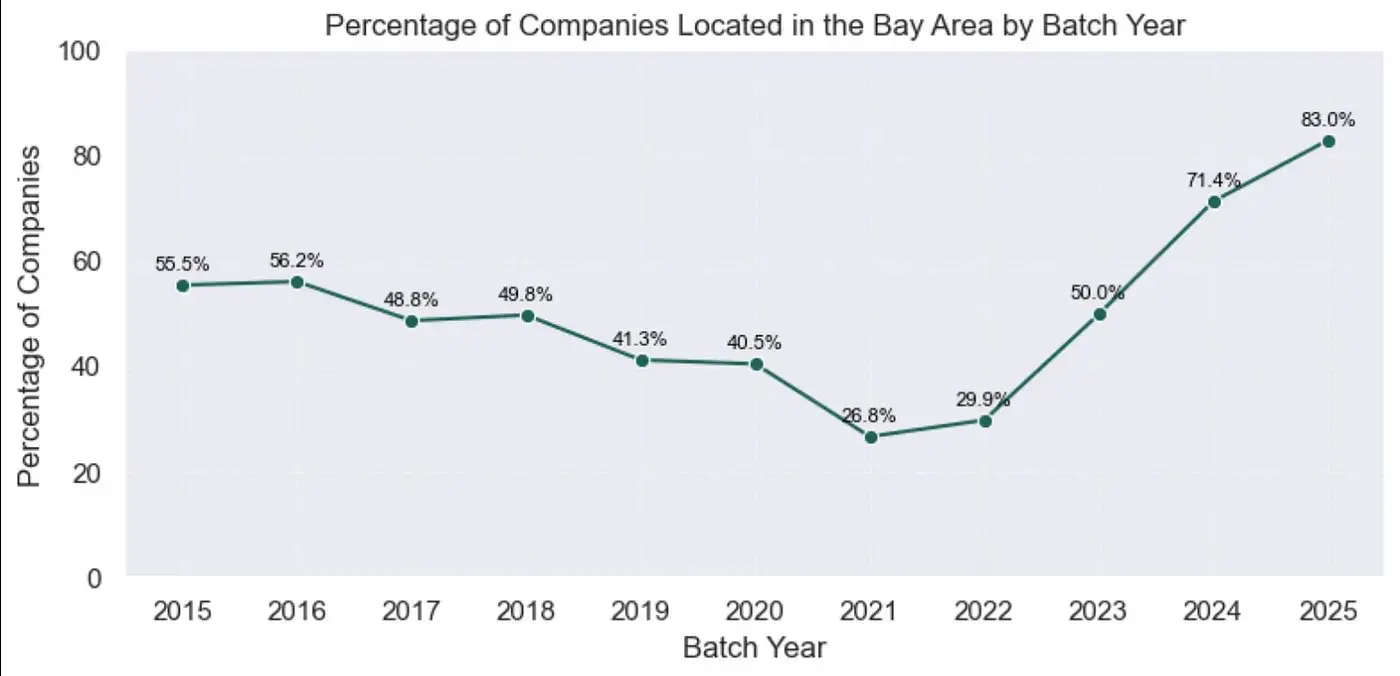 4.集中在旧金山湾区: 总部位于湾区的 YC 创始人比例甚至高于疫情前的水平,现已达到 83%