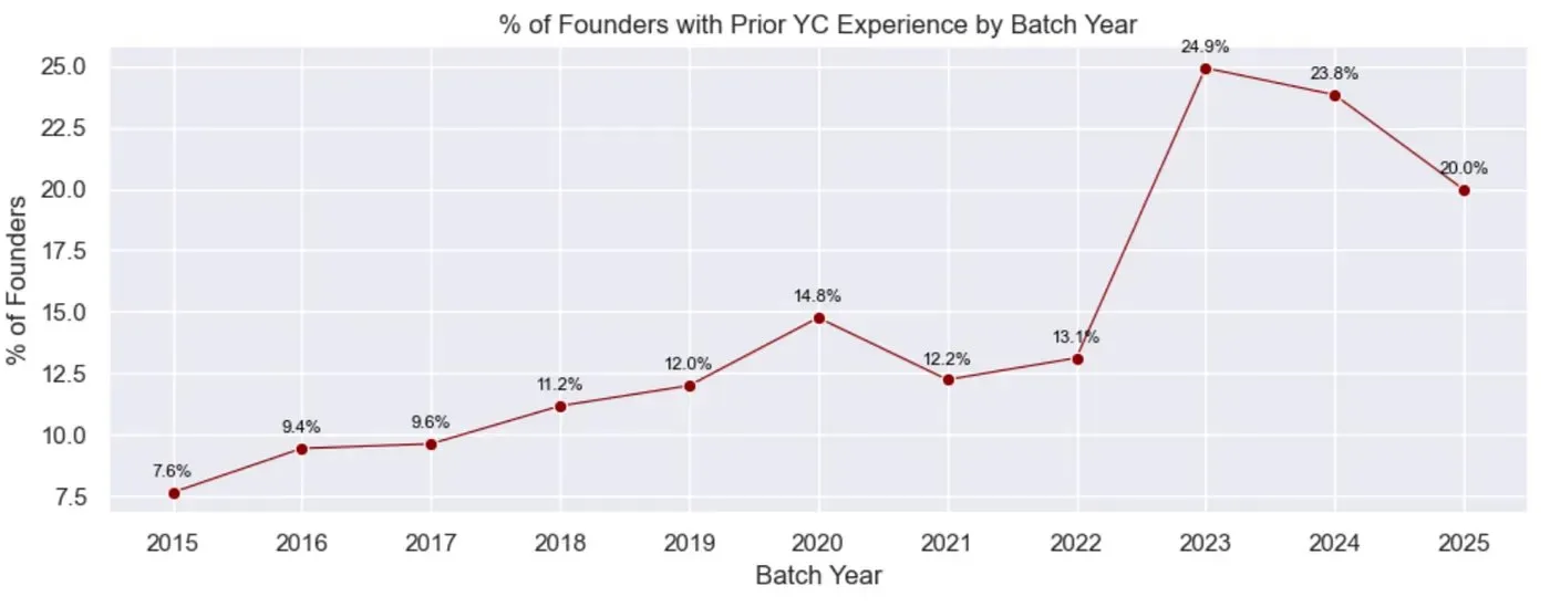 3.回归的 YC 创始人: 曾有 YC 经验的创始人数量从约 7-9% 增加到约 20%
