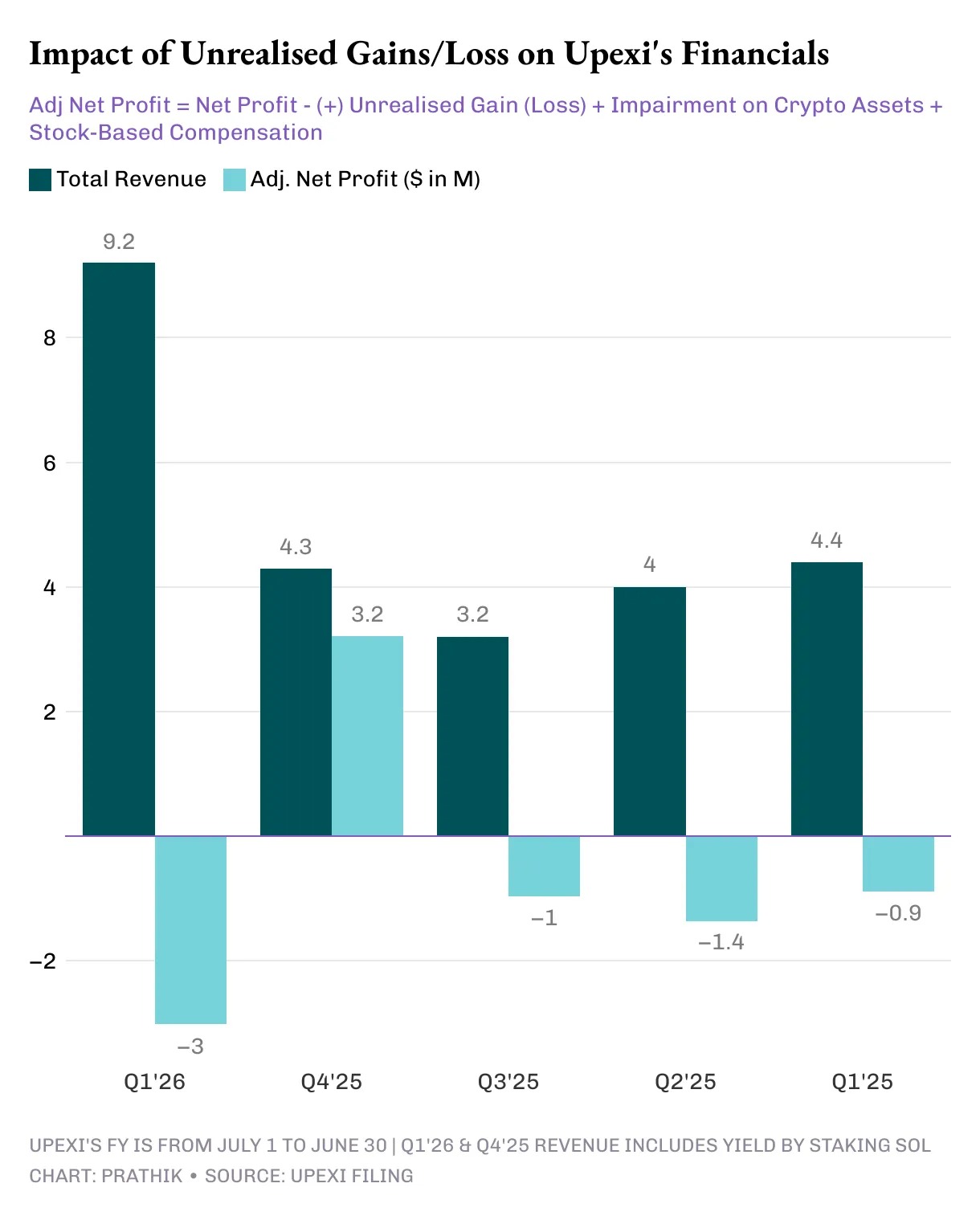 我关注 Upexi 已经有一段时间了。从运营层面来看,过去五个财年里,他们的大部分业绩都是正的。品牌收购和营收增长都表现良好,毛利率也令人满意。然而,从企业层面来看,Upexi 在过去四个财年里都出现了净亏损。