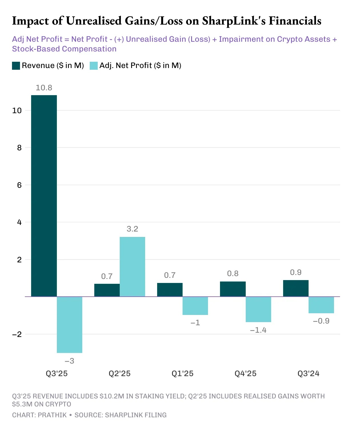 不到一年前,我还会把 SharpLink 描述为一家小众的体育联盟营销公司,那种只有在超级碗期间才会被人想起的公司。它的财务状况看起来和其他中等规模的同行没什么两样:收入微薄,业绩受体育赛事日程的季节性波动影响,而且损益表经常出现亏损。