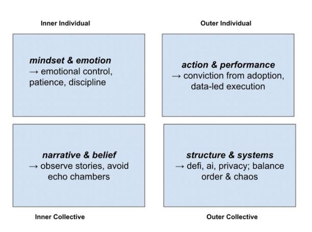 采用整体理论的投资者不仅仅是购买代币或叙事,他们观察现实的所有四个层面,将数据与直觉、逻辑与感受、秩序与无政府状态整合起来。他们理解资本流动本身即反映了意识。