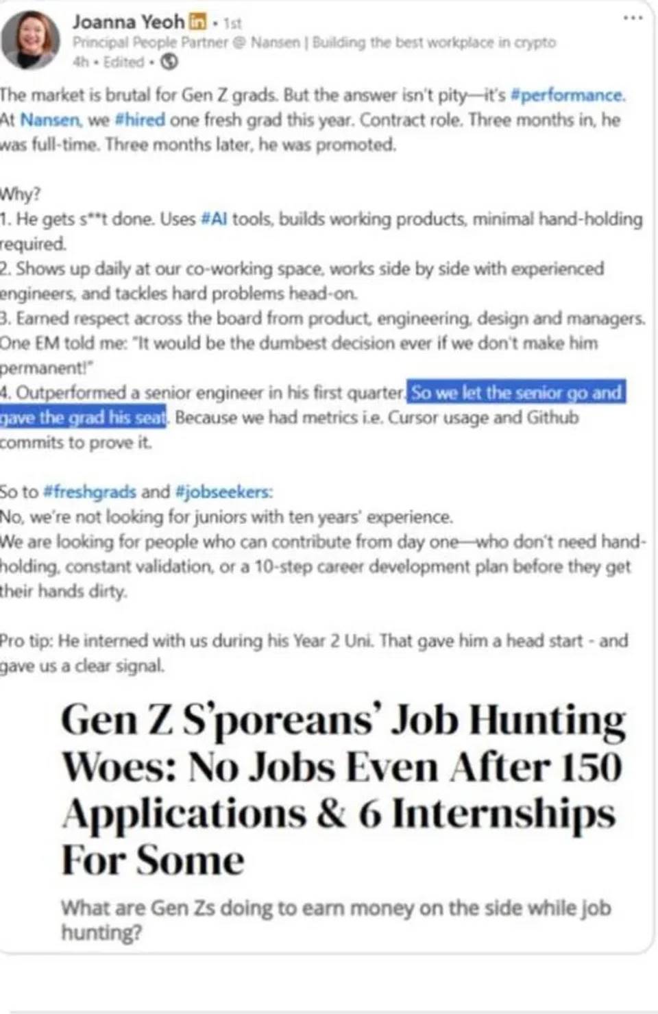 根据匿名用户分享的截图(同时也在 subreddit r/singaporejobs 上流传),杨在帖子中提到,这位应届毕业生在三个月内“超越了一位资深工程师”,随后这名资深员工被解雇,而“这位毕业生接替了他的职位”。
