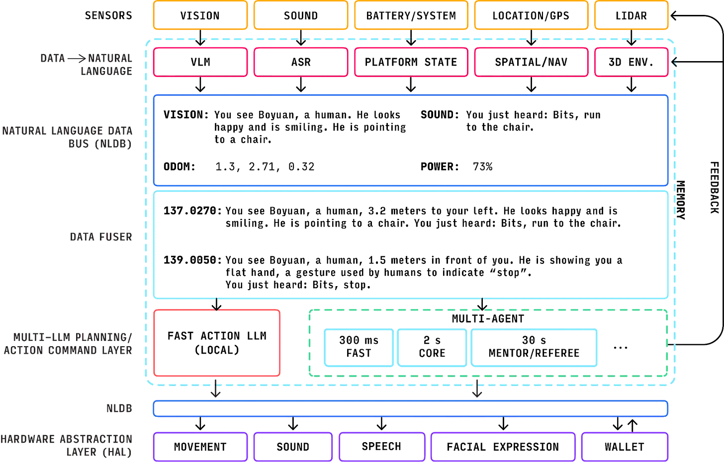 首先,机器人从摄像头和麦克风等各种传感器模块收集环境信息。这些数据以二进制格式输入,但多模态识别模型将其转换为自然语言。VLM(视觉语言模型)处理视觉信息。ASR(自动语音识别)处理音频。这会生成诸如”一个男人指着前面的椅子”和”用户说’去椅子那里’”这样的句子。