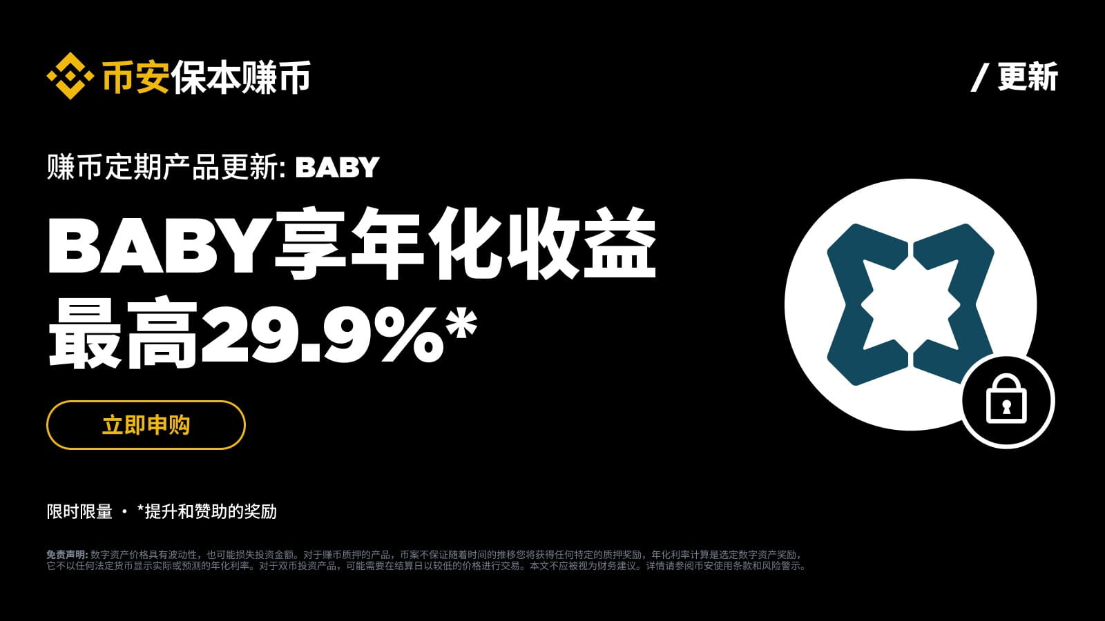 币安赚币平台将推出Babylon(BABY)定期产品专属活动!活动期间申购BABY定期产品的用户,享最高29.9%年化收益率。