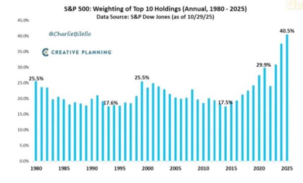 目前约前 10 家公司约占美国主要股票指数市值的 40%。