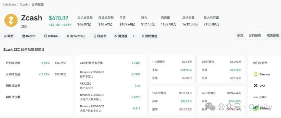 ZEC 成合约集中持仓标的:24 小时交易量仅次于 BTC、ETH