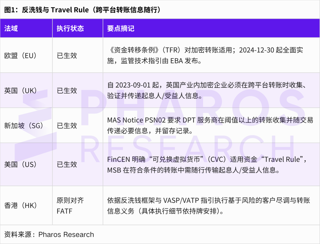 自 2018 年以来,反洗钱(AML)与打击恐怖融资(CFT)要求全面延伸至加密资产领域已经成为全球监管共识。在国际层面,金融行动特别工作组(FATF)于 2019 年修订第 15 号建议,将虚拟资产服务提供商(VASPs)纳入与传统金融机构同等严格的 AML/CFT 义务范围[1]。FATF 并推出「旅行规则」(Travel Rule),要求 VASPs 在大额加密交易时收集并向对方机构传送交易发起人和接受者的身份信息[13]。这一全球标准为各国国内立法树立了基准。时至 2025 年,绝大多数主要司法辖区已将 VASPs 纳入本国反洗钱监管体系,建立起客户身份识别(KYC)、可疑交易报告等制度。据 FATF 最新报告,全球已有 99 个司法管辖区颁布或推进相关法规落实旅行规则,加强虚拟资产跨境交易透明度[14]。