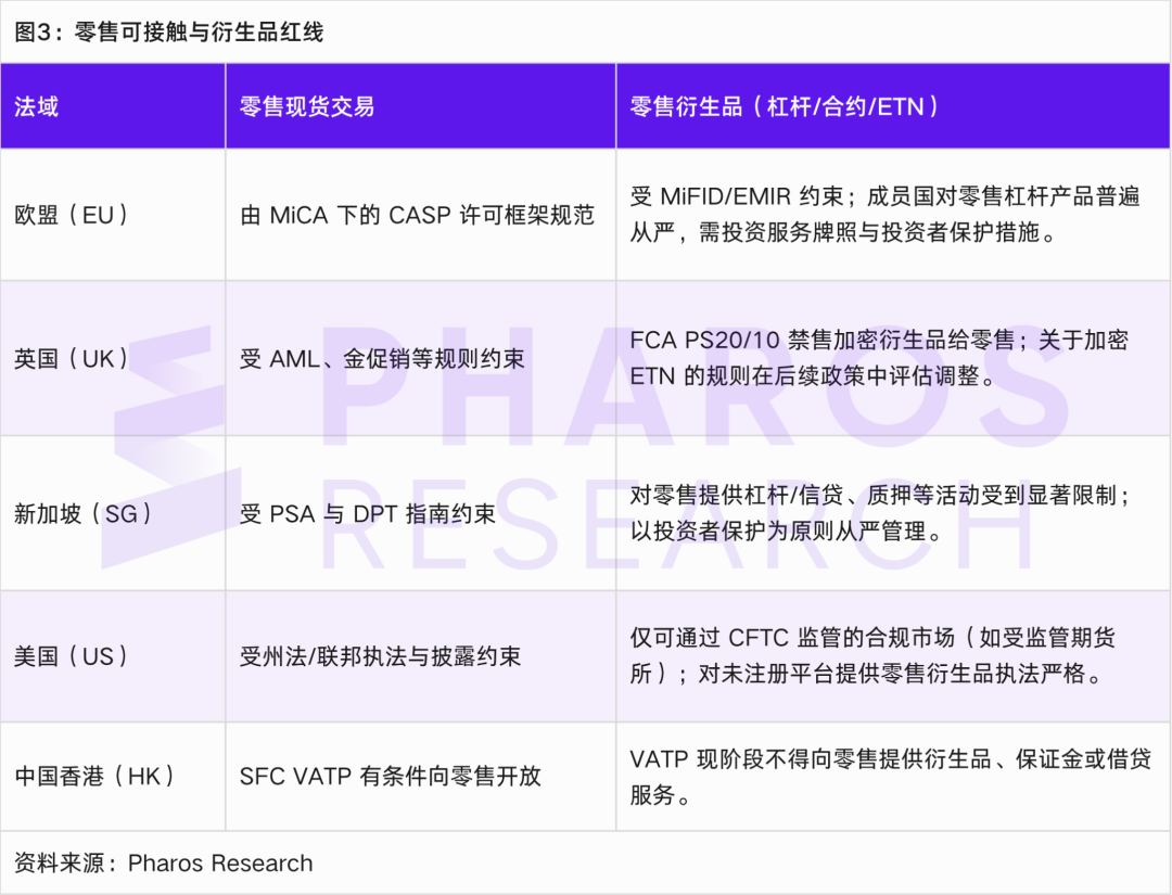 亚洲各国对于加密衍生品的监管呈现截然不同的取态。日本于 2019 年修订《金融商品取引法》,将加密资产衍生品纳入金融商品类别,并对从事加密差价 / 期货交易的业者实施注册监管。日本交易所可为客户提供加密保证金交易,但日本自律规则已将最大杠杆率从 25:1 大幅调降至 2:1。因此,日本用户仍可交易小杠杆的比特币合约,但市场规模受限。韩国则干脆禁止本国交易所提供任何形式的加密期货或期权,认为散户风险过高;韩国投资者如要交易,只能借道海外平台,但韩国政府近年加强监控,要求银行限制对海外加密衍生品平台的汇款。香港在 2023 年推出持牌制度时,明确不允许向散户提供加密衍生品交易,只能提供标的现货交易;专业投资者是否可以通过香港平台参与衍生品也受严格限制。香港仅允许经证监会批准的资产管理公司发行挂钩加密的结构性产品或 ETF 在受监管市场交易(如香港交易所上市的加密资产期货 ETF,面向公众)。新加坡 MAS 对衍生品持谨慎态度,2019 年批准新交所 (SGX) 上市比特币、以太坊掉期合约,但规定零售不能直接参与,仅开放给机构和专业投资者。此外,MAS 在 2022 年强化投资者保护指引中,限制零售获取高风险加密产品,包括衍生品,并要求本地服务商不得通过 ATM 或广告轻易向公众推广任何加密交易服务。总体看,亚洲主流市场多限制零售接触加密衍生品:日本允许但监管严、杠杆低;香港、新加坡、韩国几乎禁止散户参与,只对机构 / 专业开放有限渠道。这与部分西方市场的开放形成对比。