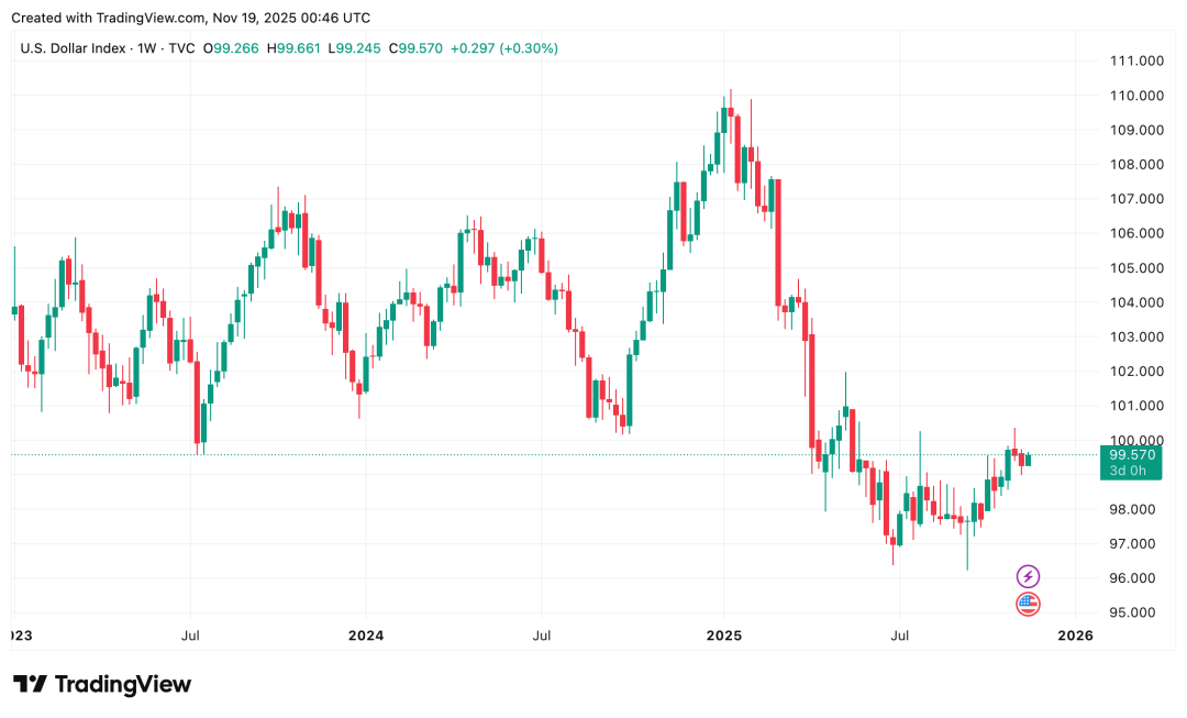 货币流动性趋紧。市场对美联储在12月会议上降息的预期近几周不断下降,市场隐含降息概率目前约为45%,低于一周前的60%,更远低于10月会议时的90%。因政府停摆导致的数据空窗期,让政策制定者之间不断加剧的分歧难以得到化解。多位此前支持降息的官员上周表示,除非看到就业恶化或通胀改善,否则将反对进一步降息。美股市场避险情绪高涨,资金从科技股中流出。加密市场进入熊市。
