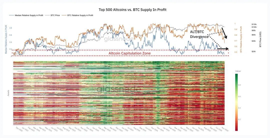 BTC 短期持有者实际亏损创两年新高,恐慌抛售已达顶峰,目前已超过本轮周期前两次主要低点时的损失水平。山寨币仅有约5%供应量处于盈利,BTC 的盈利比例开始急剧下降。