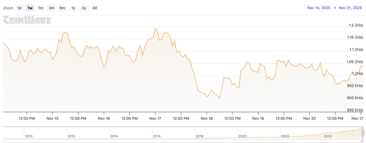 从趋势上看,全网算力仍维持在高位,波动频率高但幅度有限,整体呈现偏强态势。受北美矿区电力供应趋稳影响,多家矿企的算力陆续恢复上线,使全网算力始终保持强劲支撑。本周算力的主要波动仍与币价走势保持同步:在 11 月 18 日比特币价格阶段性回调时,全网算力随之出现短暂下探,最低约落至 905.54EH/s;随后伴随价格快速反弹,算力也同步回升并在周末逼近阶段高点。在高难度、高能耗持续叠加的背景下,矿工利润受到挤压,使算力在高位区域内出现短期调整,但整体趋势仍表现稳健。