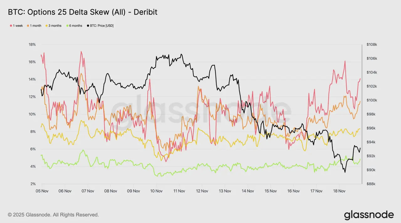 比特币短暂跌破九万美元后,期权市场立即重新定价风险,所有期限的隐含波动率明显上升,短端涨幅最为突出。这反映了两大动力:其一,市场对下行保护需求激增;其二,大量短伽马仓位被迫回补并向上滚动,使短期限波动率被动推高。目前的隐含波动率水平已接近十月十日清算事件时的高点,显示交易者快速提升对短期风险的评估。25-delta 偏斜在全部期限都保持负值,一周期限更接近极端看空水平,一周期看跌期权的溢价约为14%,表明市场愿意显著提高下行保护成本。这类买盘会导致做市商空 delta,对冲时进一步卖出期货或永续合约,可能形成自我强化的下压效应。中长期偏斜虽同样偏空但不及短端,六个月期限约略低于5%,显示压力主要集中在短期窗口。