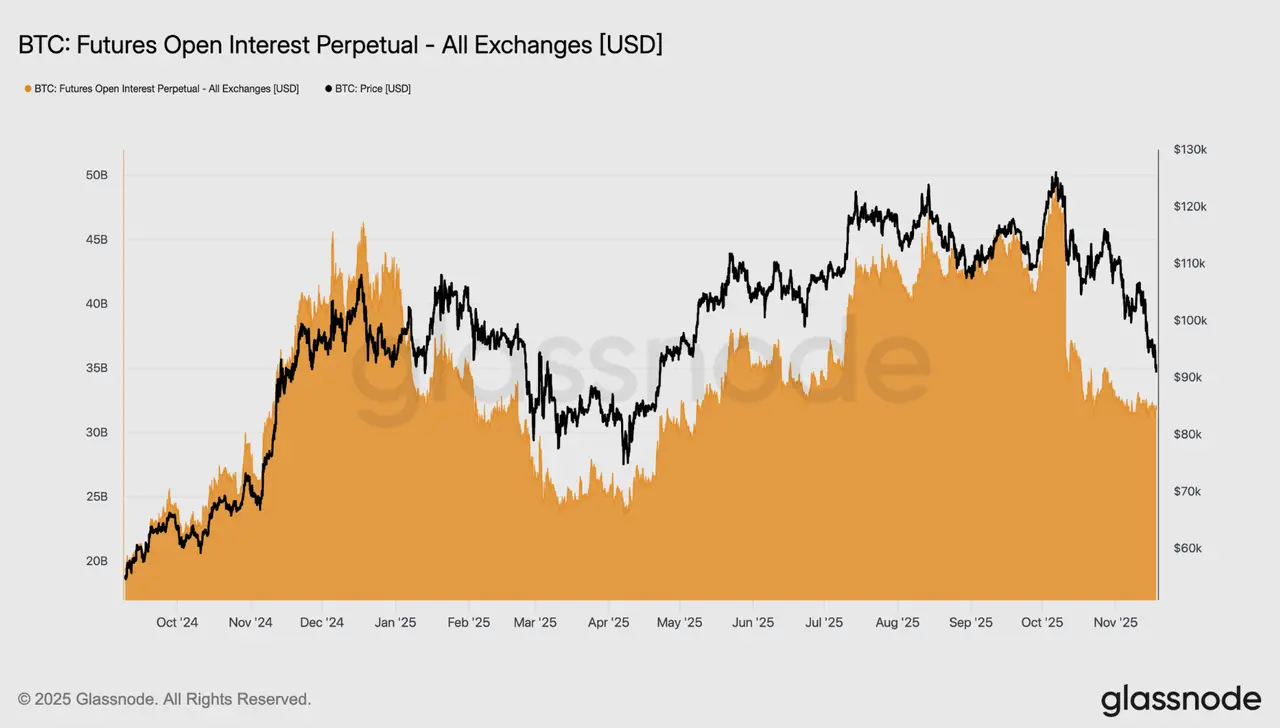 随着期货未平合约持续下降,衍生品市场明显减少了投机性仓位。交易者选择解除风险,而非增加暴露于弱势,使得开放指数相较于之前的回撤明显杠杆不足。