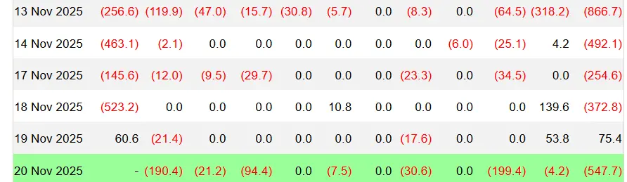 本周期内 ETF 呈现「大规模流出 → 短暂流入 → 再次流出」的结构性弱势。上周四11月13日最终比特币ETF资金流出达到8.667亿美元,为本月迄今最大单日流出。11月14日至18日资金流出较13日收窄,但资金撤离趋势未止。19日流入少量0.754亿美元反弹,此次反弹由贝莱德的IBIT领衔,带来了6060万美元。然而,这一回弹仍未能弥补该基金前一天损失的超5亿美元。20日再次大幅流出5.477亿美元。