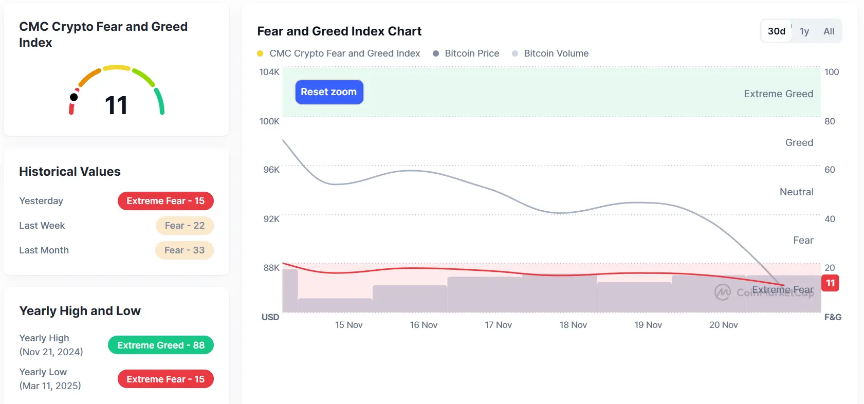 截至11月21日,「恐惧与贪婪指数」约为11点,处于“极度恐惧”区间。