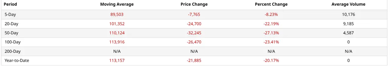 支撑位:$86,000, 若跌破可能测试 $82,000–84,000