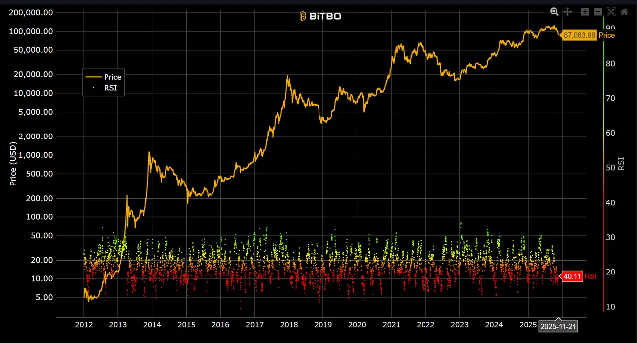 截至本周期末,比特币 14 日 RSI 为 40.11,未触及超卖(RSI<30),较前几日有所回升,但仍处明显弱势区间内。RSI 持续位于 30–45 区间说明市场仍偏弱, 短线超卖压力有所释放,但反弹动能暂不足。
