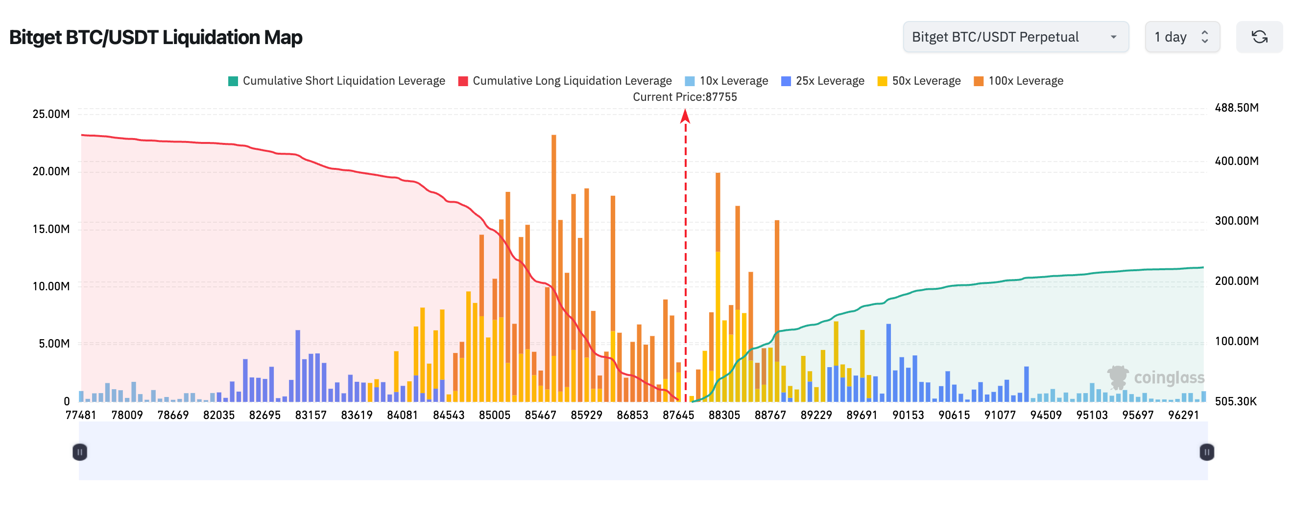 3、Bitget BTC/USDT清算地图显示:BTC 当前价 87,755 美元正处于多头高杠杆密集区(约85,000–88,000)上方不远,下行容易触发连续多头爆仓。上方空头清算带相对分散、累积规模更小,向上突破的阻力明显弱于下跌的连锁风险。