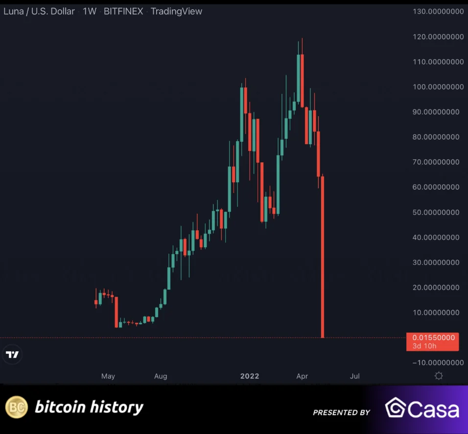 仅几天时间,LUNA价格就从接近90美元一枚跌到了不足0.015美元一枚,价格几乎归零,曾经市值高达400亿美元的LUNA生态瞬间灰飞烟灭,无数人血本无归。