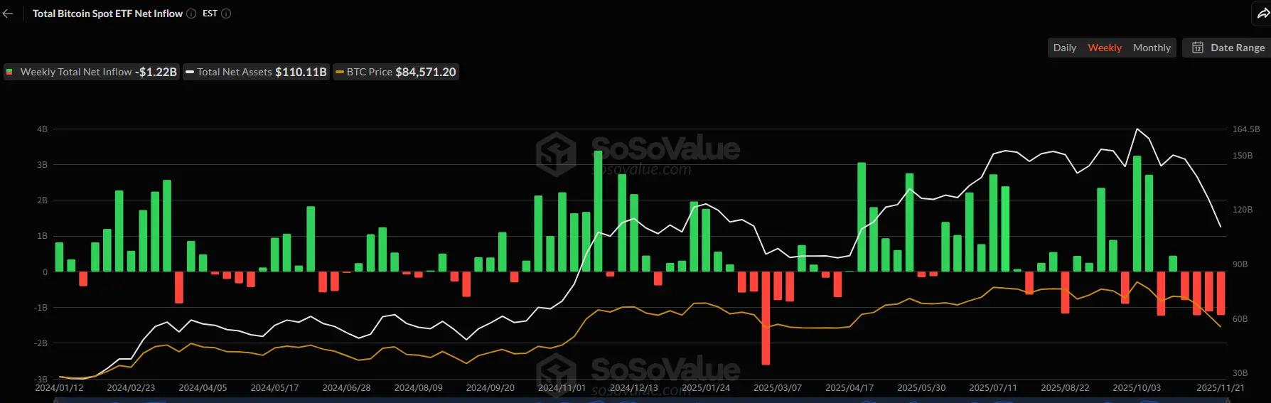 截止至发稿,美国比特币现货ETF累计总净流入约576.4亿美元,本周净流出12.2亿美元;美国以太坊现货ETF累计总净流入约126.3亿美元,本周净流出5亿美元。