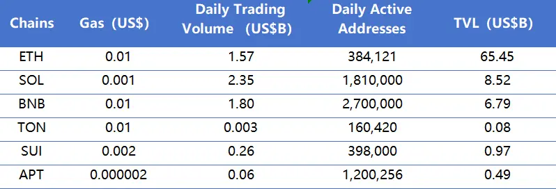 主要从日交易量、日活跃地址、交易费用分析目前主要Layer1含ETH、SOL、BNB、TON、SUI以及APT的相关数据。