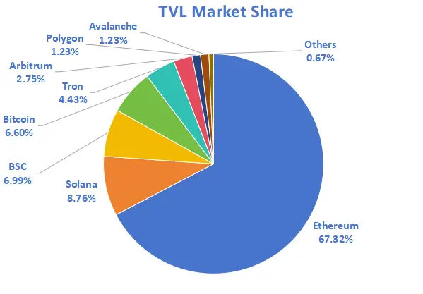 按公链进行划分,其中TVL最高的三条公链分别是Ethereum链,占比67.32%;Solana链,占比8.76%;BNB Chain,占比6.99%。