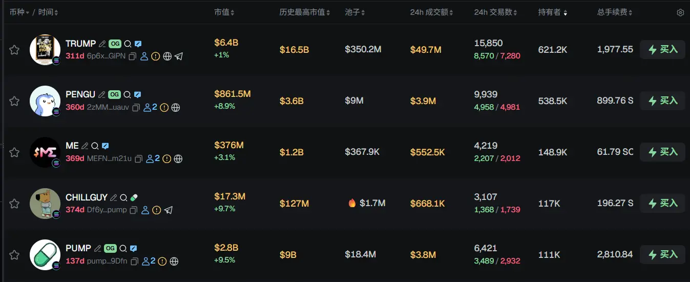 过去 24h Solana 热门代币前五依次为:TRUMP、PENGU、ME、CHILLGUY、PUMP
