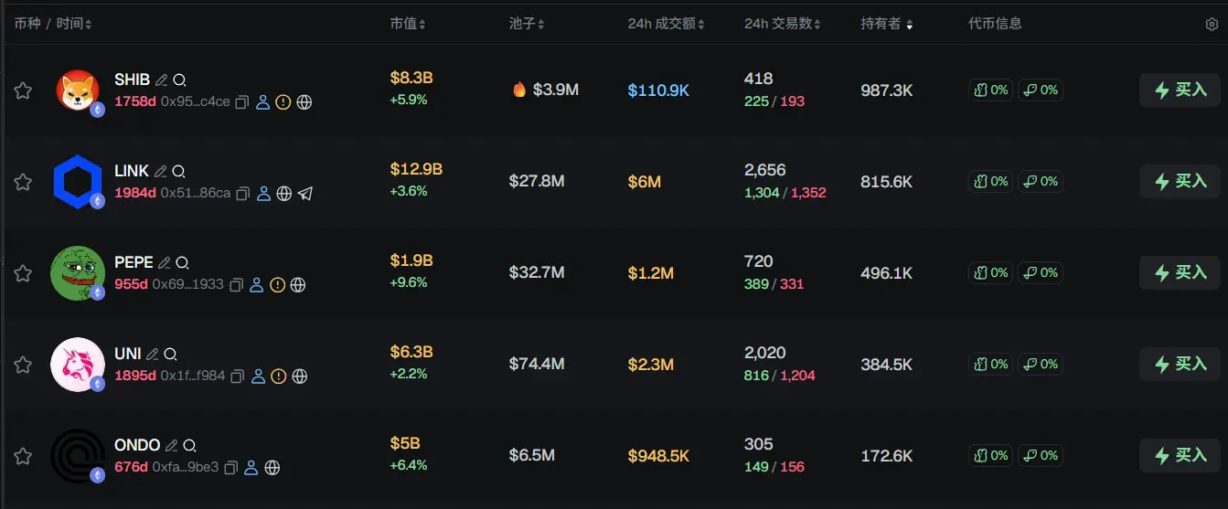 过去 24h ETH 热门代币前五依次为:SHIB、LINK、PEPE、UNI、ONDO