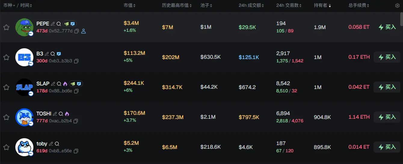 过去 24h Base 热门代币前五依次为:PEPE、B3、SLAP、TOSHI、toby