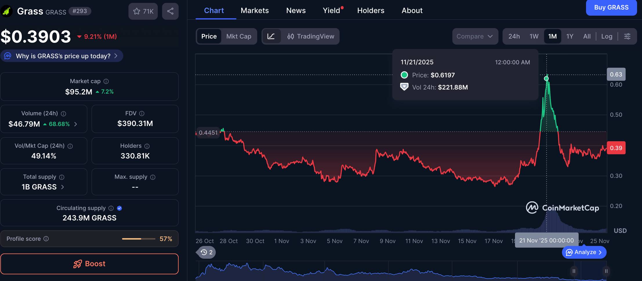 11月16日,GRASS 刚刚跌至$0.26的历史新低。不过一周后,代币反弹超过45%,同期跑赢大盘。