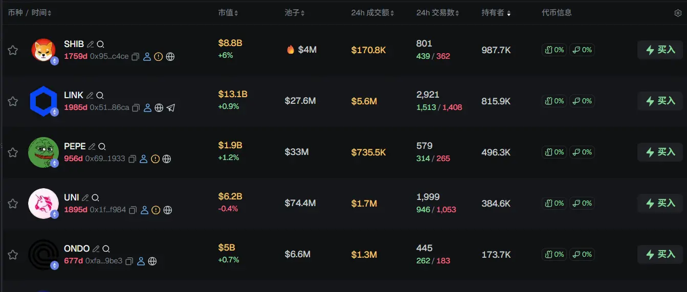 过去 24h ETH 热门代币前五依次为:SHIB、LINK、PEPE、UNI、ONDO