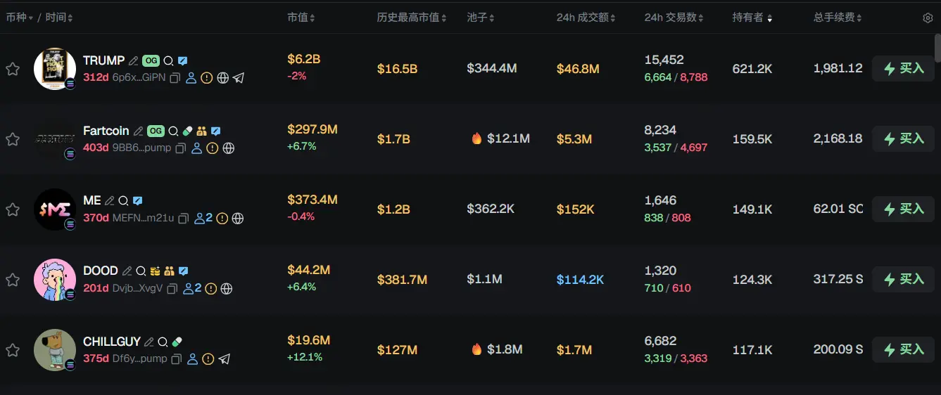 过去 24h Solana 热门代币前五依次为:TRUMP、Fartcoin、ME、DOOD、CHILLGUY