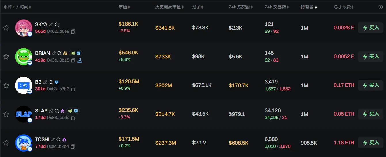 过去 24h Base 热门代币前五依次为:SKYA、BRIAN、B3、SLAP、TOSHI