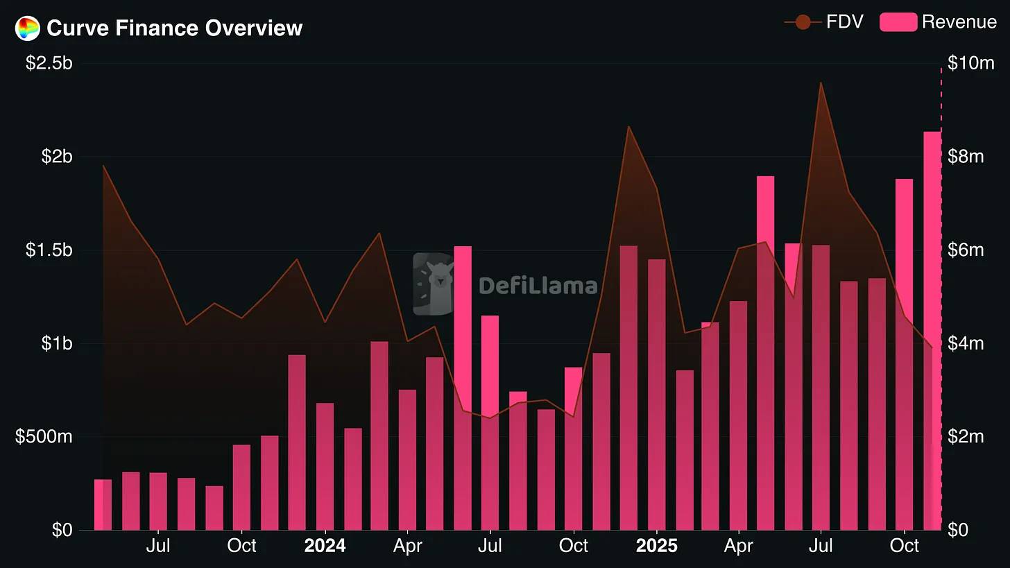 Curve Finance 过去三年实现了稳定且持续的收入增长,即便完全稀释估值(FDV)有所下降。最终,其 FDV 已降至不足 Curve 过去一个月年化收入的 8 倍。