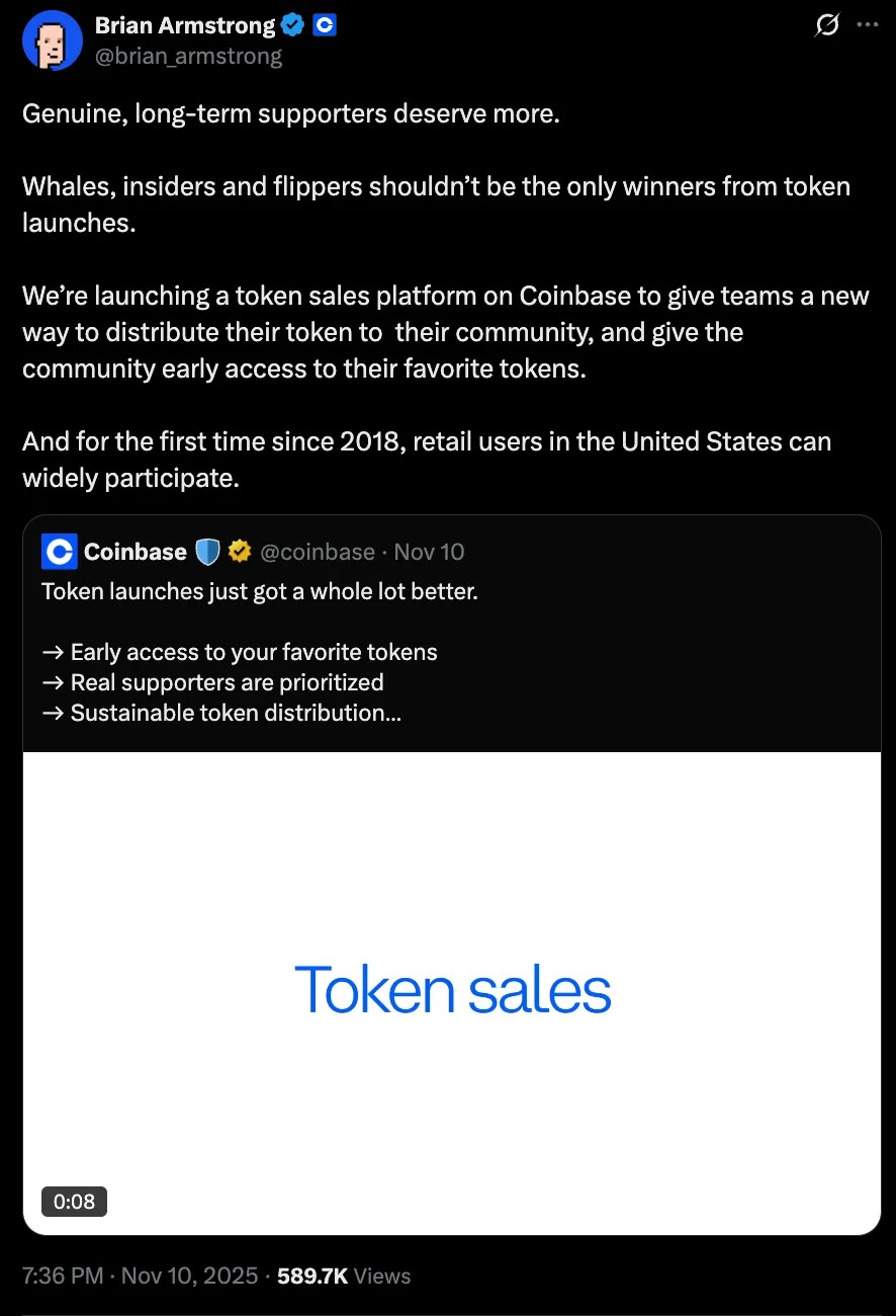10 月份,Coinbase 收购了 Echo,并于本月初推出了其代币销售平台;9 月份,Kraken 与 Legion 达成合作。与此同时,Binance 与 Buildlpad 关系密切,而 PumpFun 则正尝试通过 Spotlight 发行实用型代币。
