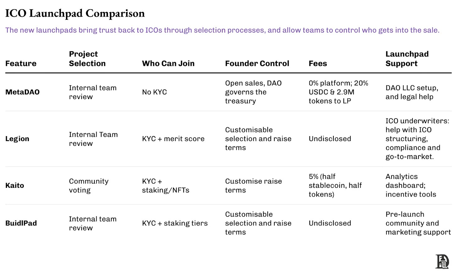 目前,Legion、Buildlpad、MetaDAO 和 Kaito 等平台正在涌现,成为新型 Launchpad 的代表。第一步是对 ICO 项目进行审核,以确保投资者对 Launchpad 平台的信任;下一步则是审核参与的投资者,以确保资金分配符合项目标准。