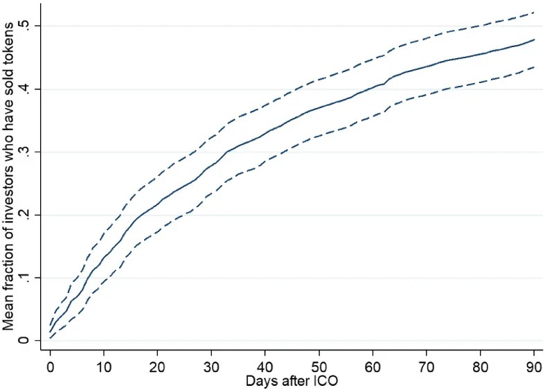 2017 年至 2019 年间,ICO 投资大多采用先到先得的模式,投资者蜂拥而至,试图以较低的估值入场,通常是为了在项目启动初期快速获利。对 300 多个 ICO 项目的研究数据显示,30% 的投资者在项目启动后的第一个月就退出了。