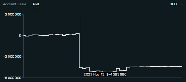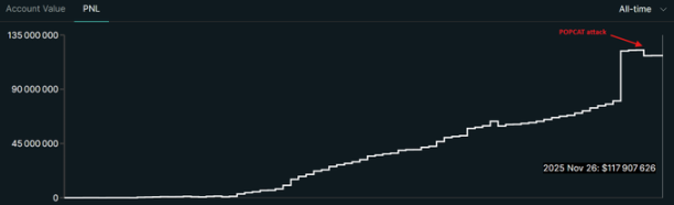 因此,如果某个市场(如 POPCAT/HYPE)崩盘,全局的 HLP 就会承受打击。总体而言,HLP 一直非常盈利,并且长期来看他们一直在赚钱。总计他们已经产生了 1.18 亿美元的净利润。与他们自成立以来积累的收益相比,这次 500 万美元的攻击显得微不足道。