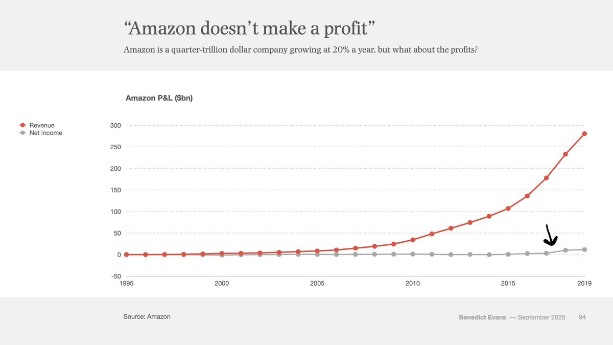 这是亚马逊从 1995 年到 2019 年的利润表(P&L),整整 24 年。红色代表收入,灰色代表利润。你看到末尾那小小的波动了吗?灰色线开始向上,那是亚马逊在成立 22 年后,第一次真正开始盈利的时候。