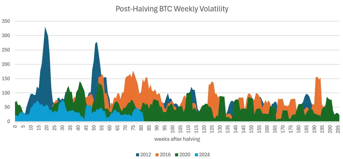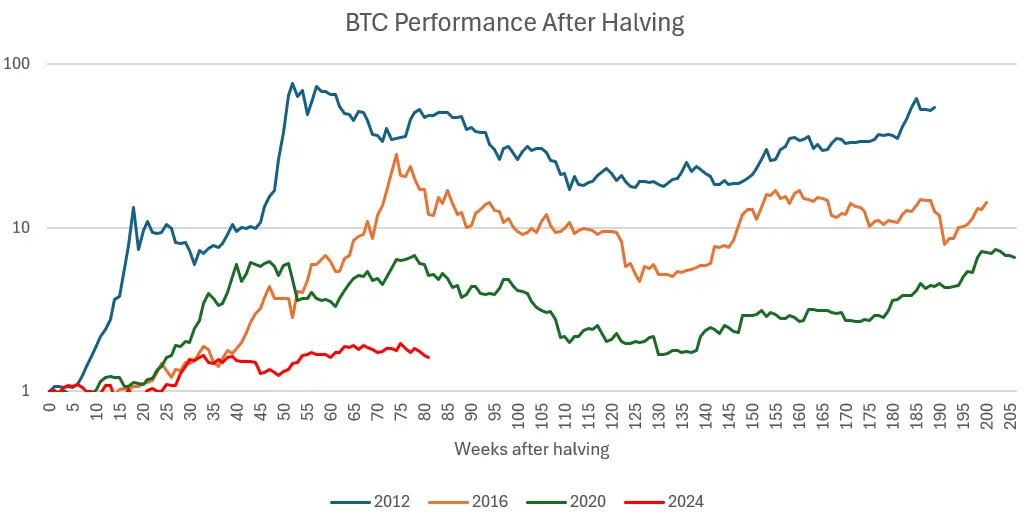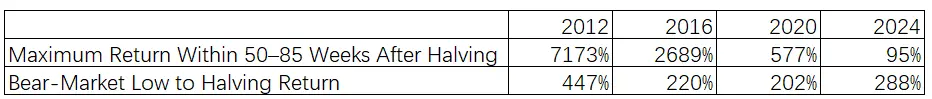 以减半时间为周期起点复盘过往几轮行情,可以发现:传统周期中,牛市通常会在减半后约50–85周达到顶点,期间价格斜率持续上升,并伴随市场情绪的加速扩张(FOMO阶段)。尽管随着BTC市值提升,每轮涨幅边际递减,但仍形成了可识别的结构性上升。