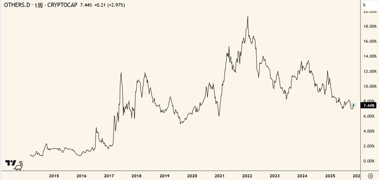 在传统四年周期中,减半后BTC创新高往往伴随着资金向山寨币市场的外溢,进而引发“Alt Season”式的全面行情高潮。历史上这一阶段通常标志着牛市后期风险偏好的极度扩张。然而,本轮周期中,这一经典链式反应并未出现——BTC 虽已早早突破历史高点,但市场并未出现预期中的“板块共振”,山寨币表现明显低于历史同期。下图显示,自2021年底以来,Altcoin市值占比持续下降,即便在BTC创新高阶段也未出现历史典型的“Altcoin Dominance 反弹”,进一步验证了市场资金集中化与叙事分散化的趋势。