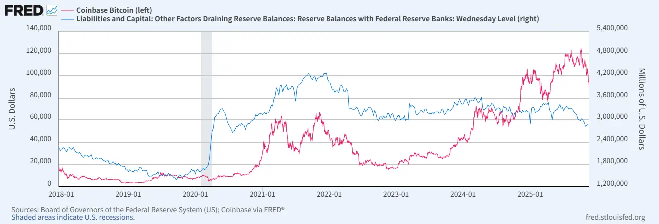 这种一致性并非偶然,而是反映了机构化时代加密资产的本质变化:比特币正在变成流动性与风险偏好的宏观放大器。机构投资者的配置行为、ETF 的申购机制、衍生品市场的对冲活动都高度依赖于资金成本、融资条件以及体系内流动性的松紧程度。当准备金水平上升且融资环境改善之时,比特币的买盘力量不仅增强,而且更具持续性;而当准备金下降或流动性收紧时,机构的风险预算收缩往往会率先体现在 BTC 的趋势放缓上。