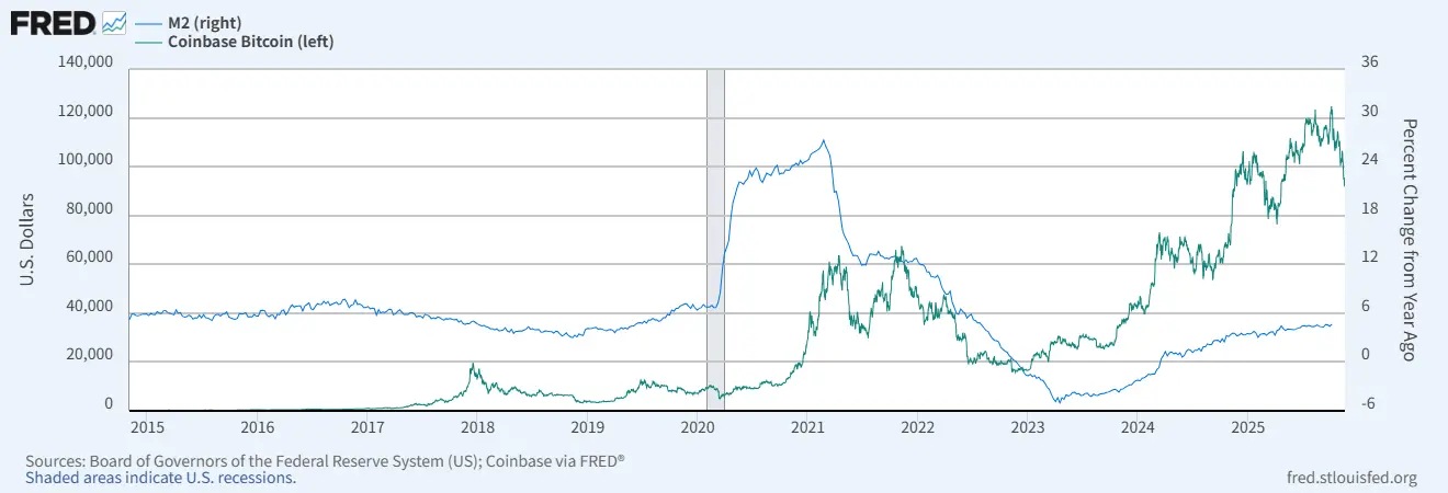 M2 与比特币价格之间的关系也呈现出类似的同步结构,尽管 M2 是一个相对更慢、更宏观的流动性指标,但其变化方向与 BTC 的中长期趋势仍然保持明显的共振。在 M2 扩张阶段,比特币往往进入上行区间;在 M2 增速放缓或转负的阶段,比特币则更容易出现趋势中断或较深幅度的回调。M2 的变动体现了更广义的货币环境以及居民部门、实体经济与金融体系之间的流动性循环。当这一循环运行顺畅、信用扩张更有余地时,风险资产的中长期表现往往优于流动性紧缩时期,而比特币作为高弹性资产,对这一过程的反应更加放大。