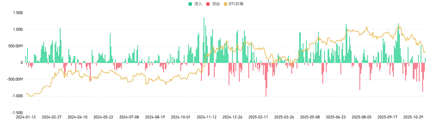首先,现货比特币ETF的推出改变了市场的增量资金结构。从下图中可以看到,自ETF获批并大规模流入以来,比特币价格与ETF的净申购节奏几乎同步。过去比特币的价格惯性更多来自链上叙事和投机性资金流,但本轮周期中,中期价格趋势与ETF净流入呈显著同向关系。尤其是在ETF持续净申购阶段,BTC 价格呈现稳定的斜率上行,而在净赎回或流入放缓阶段,BTC 价格也随之进入高位震荡。ETF的申购机制实质上成为比特币的“被动买盘引擎”,大量传统资金通过ETF完成配置,使价格从“情绪驱动”转向“流量驱动”。这一结构变化标志着比特币的增量需求首次被纳入全球资产配置体系,而非依赖内部投机循环。